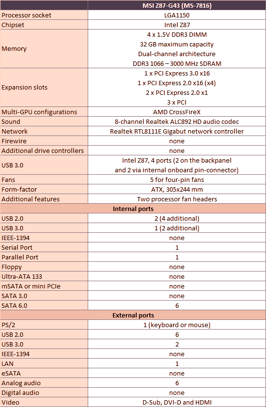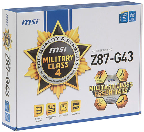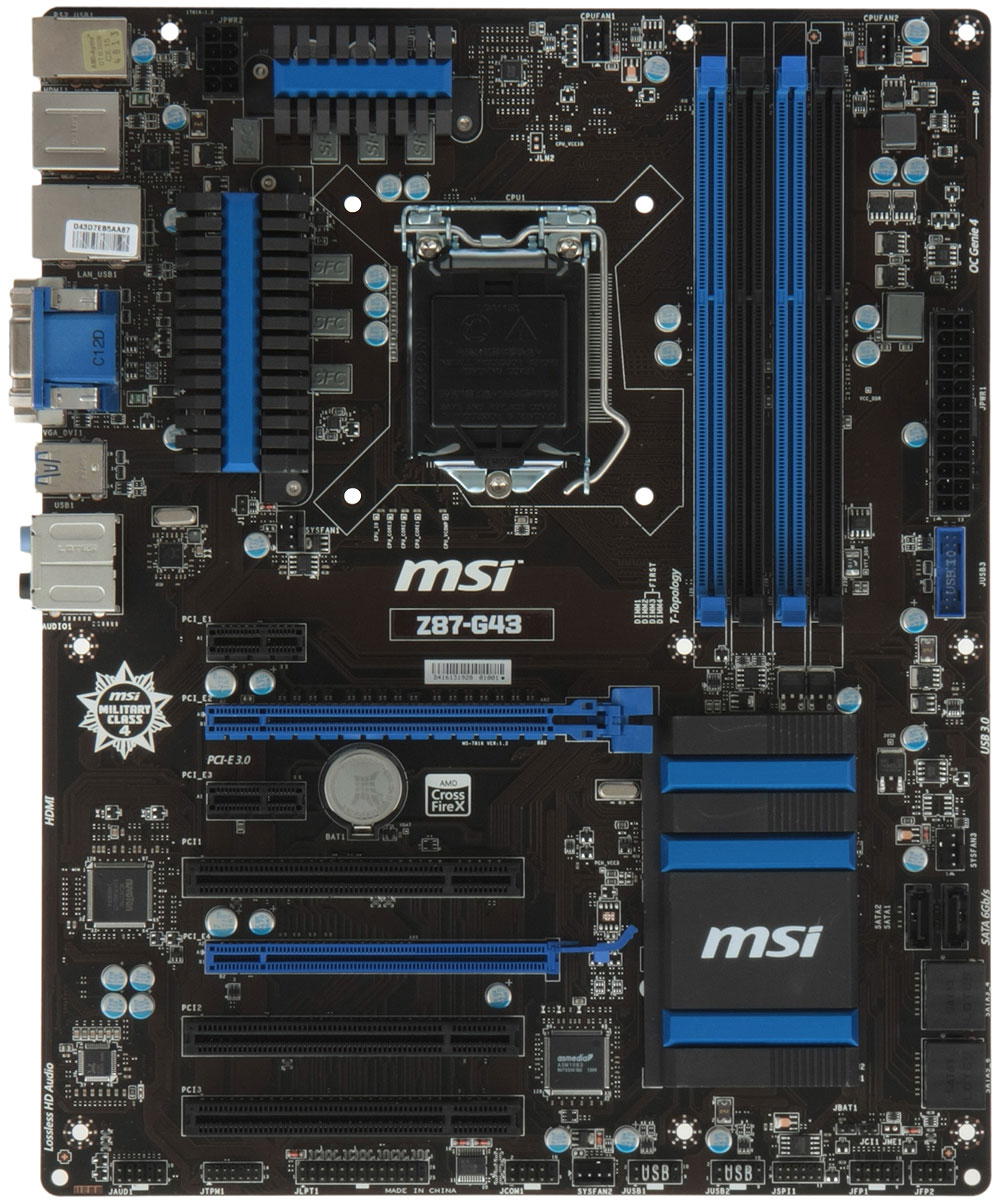 Ο ρυθμιστής τάσης της μητρικής δεν ενσωματώνει στο σχεδιασμό του πολλές φάσεις ρεύματος, αλλά μπορεί να τροφοδοτήσει χωρίς κανένα πρόβλημα κάθε σύγχρονο επεξεργαστή Intel Core 4ης γενιάς. Παρατηρούμε μεγάλες ψύκτρες στερεωμένες με βίδες στα σημεία που ανεβάζουν μεγάλες θερμοκρασίες. Η μητρική MSI Z87-G43 είναι ένα entry-level μοντέλο της σειράς αυτής. Δεν μπορεί να μοιραστεί τις CPU-integrated PCIe lanes μεταξύ δύο υποδοχών που δέχονται κάρτες γραφικών και δεν υποστηρίζει την τεχνολογία Nvidia SLI. Οπότε μια ξεχωριστή κάρτα γραφικών πρέπει να τοποθετηθεί στην πρώτη πάνω PCIe 3.0 x16 υποδοχή, ενώ η δεύτερη υποδοχή PCIe x16 (σε ταχύτητα x4) βασίζεται στις PCIe 2.0 lanes του chipset. Μπορείτε να χρησιμοποιήσετε και τις δυο υποδοχές για να επιτύχετε μια διαμόρφωση AMD CrossFireX. Τα συνολικά slots της πλακέτας συμπληρώνουν δύο PCIe 2.0 x1 υποδοχές καθώς και τρεις PCI υποδοχές για κάρτες επέκτασης.