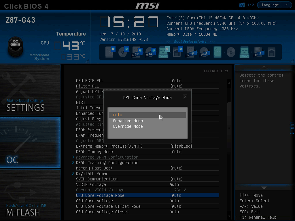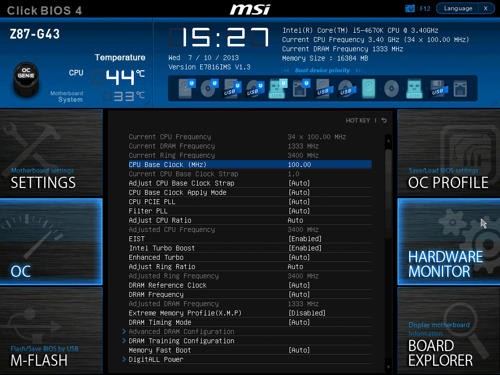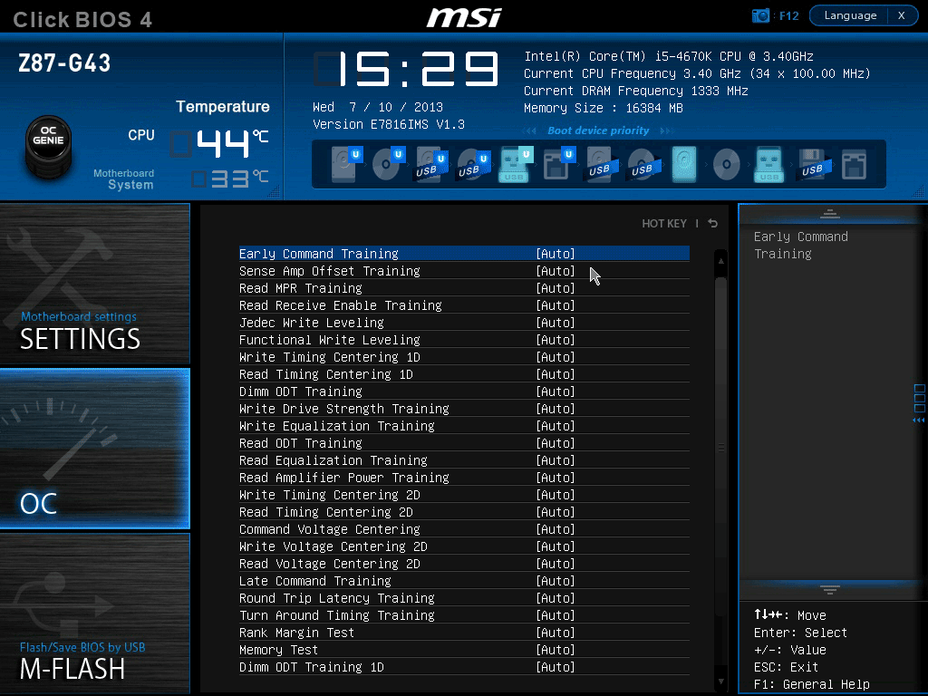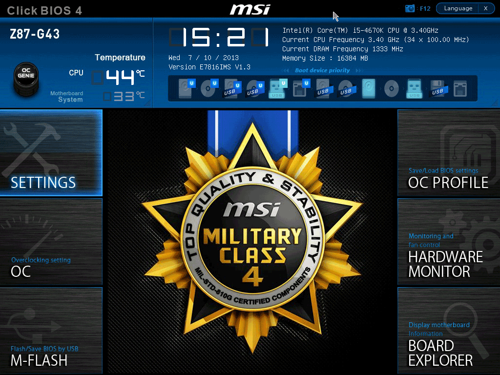 Στο κέντρο βλέπουμε το μεγάλο logo της MSI, Military Class 4. Θα ήταν προτιμότερο αντί για το logo να δινόταν η δυνατότητα στο χρήστη να προσαρμόσει τα menu όπως ακριβώς αυτός τα θέλει μιας και είναι η νέα τάση στον σχεδιασμό του bios από τις εταιρείες κατασκευής motherboard. Στην συγκεκριμένη περίπτωση αυτή η οθόνη εκκίνησης είναι άχρηστη διότι αναφέρει πληροφορίες που μπορεί να βρεθούν σε άλλα menu. Το κουμπί “OC Genie” στα αριστερά είναι για το αυτόματο overclocking του συστήματος. Μπορείτε επίσης να καθορίσετε τη σειρά εκκίνησης, μετακινώντας τα εικονίδια εκκίνησης με το ποντίκι σας. Αυτά μπορείτε να κάνετε στην οθόνη εκκίνησης του BIOS για περισσότερες ρυθμίσεις θα πρέπει να μετακινηθείτε προς τα κάτω σε κάποιο από τα τμήματα του BIOS. Στον τομέα “OC“, θα βρείτε όλες τις ρυθμίσεις που θα θελήσετε να κάνετε για να τελειοποιήσετε το overclocking σας.