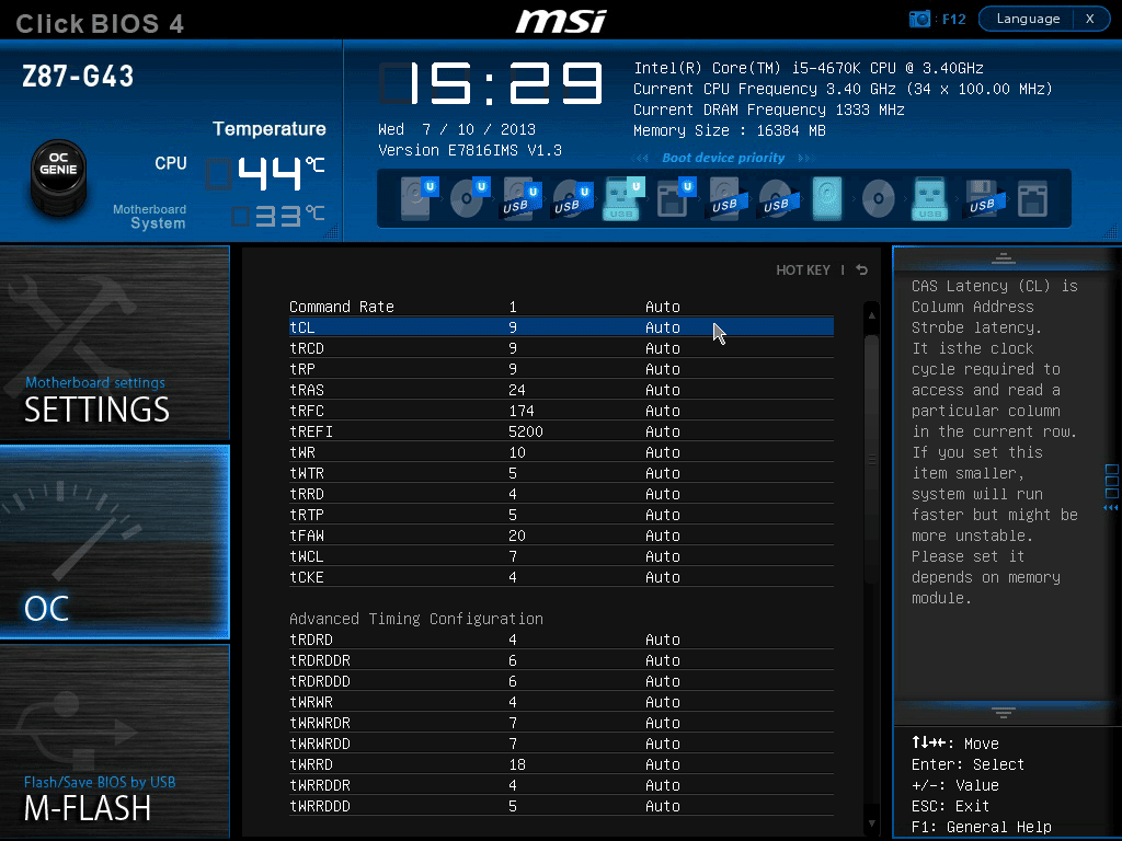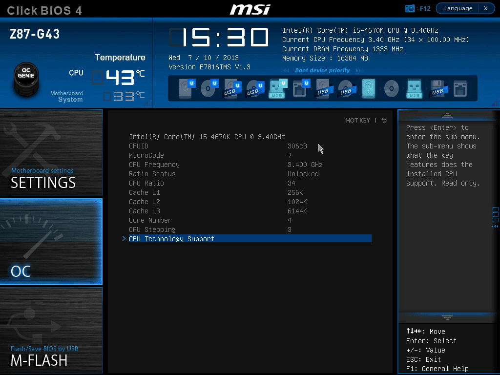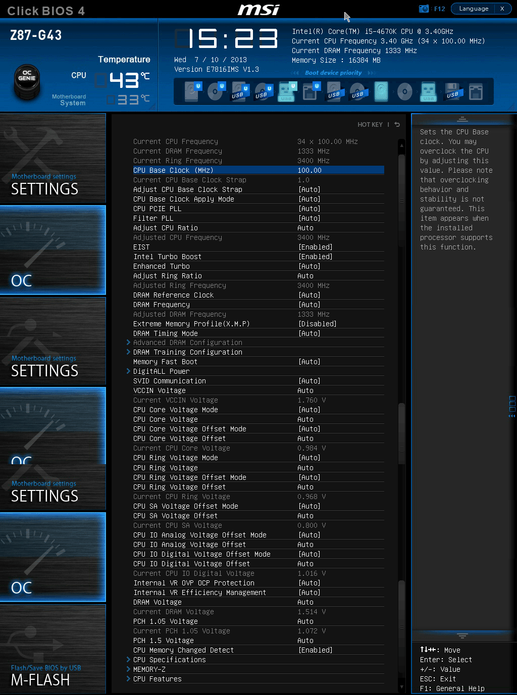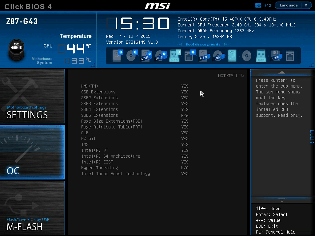 Στο κέντρο βλέπουμε το μεγάλο logo της MSI, Military Class 4. Θα ήταν προτιμότερο αντί για το logo να δινόταν η δυνατότητα στο χρήστη να προσαρμόσει τα menu όπως ακριβώς αυτός τα θέλει μιας και είναι η νέα τάση στον σχεδιασμό του bios από τις εταιρείες κατασκευής motherboard. Στην συγκεκριμένη περίπτωση αυτή η οθόνη εκκίνησης είναι άχρηστη διότι αναφέρει πληροφορίες που μπορεί να βρεθούν σε άλλα menu. Το κουμπί “OC Genie” στα αριστερά είναι για το αυτόματο overclocking του συστήματος. Μπορείτε επίσης να καθορίσετε τη σειρά εκκίνησης, μετακινώντας τα εικονίδια εκκίνησης με το ποντίκι σας. Αυτά μπορείτε να κάνετε στην οθόνη εκκίνησης του BIOS για περισσότερες ρυθμίσεις θα πρέπει να μετακινηθείτε προς τα κάτω σε κάποιο από τα τμήματα του BIOS. Στον τομέα “OC“, θα βρείτε όλες τις ρυθμίσεις που θα θελήσετε να κάνετε για να τελειοποιήσετε το overclocking σας.